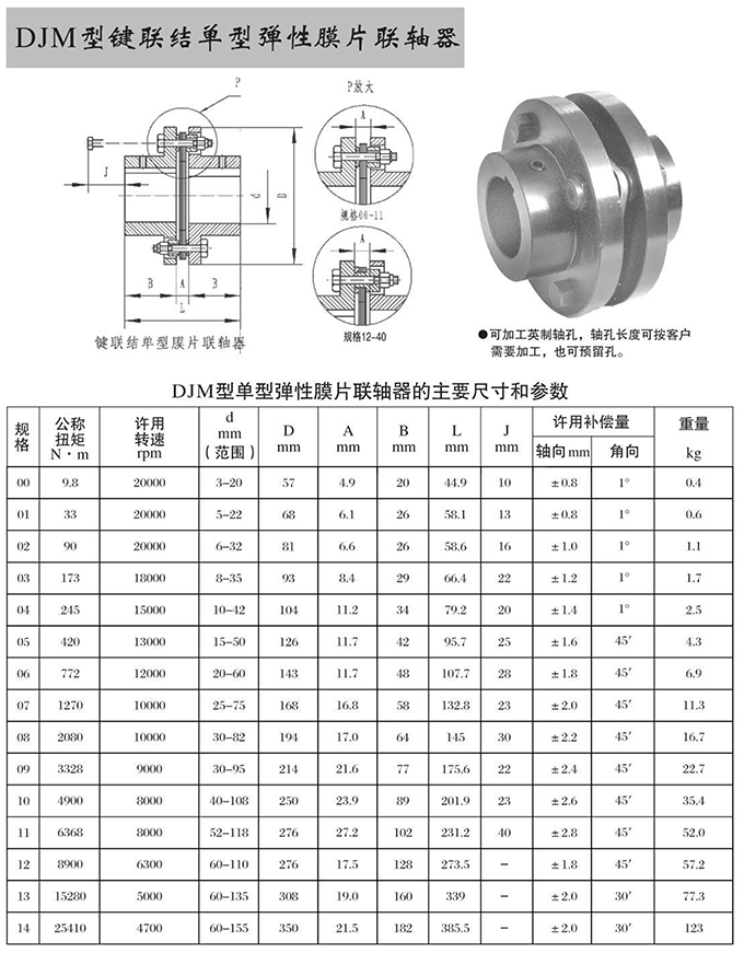 瑞安市寶德隆機械配件有限公司提供DJM型鍵聯結單型彈性膜片聯軸器具有拆裝方便,快速安裝等特點,廣泛用于連接/固定輪轂孔和零件的軸,例如齒輪,錐齒輪,鏈輪,葉輪,凸輪,皮帶輪和飛輪等軸的聯結固定,咨詢電話:18906872378