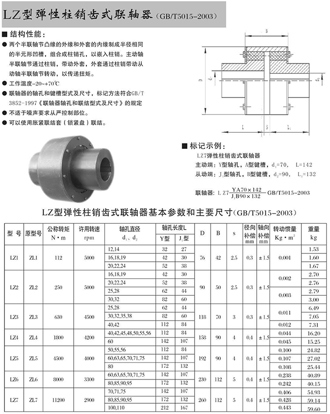 瑞安市寶德隆機械配件有限公司提供LZ型彈性柱銷齒式聯(lián)軸器具有拆裝方便,快速安裝等特點,廣泛用于連接/固定輪轂孔和零件的軸,例如齒輪,錐齒輪,鏈輪,葉輪,凸輪,皮帶輪和飛輪等軸的聯(lián)結(jié)固定,咨詢電話:18906872378